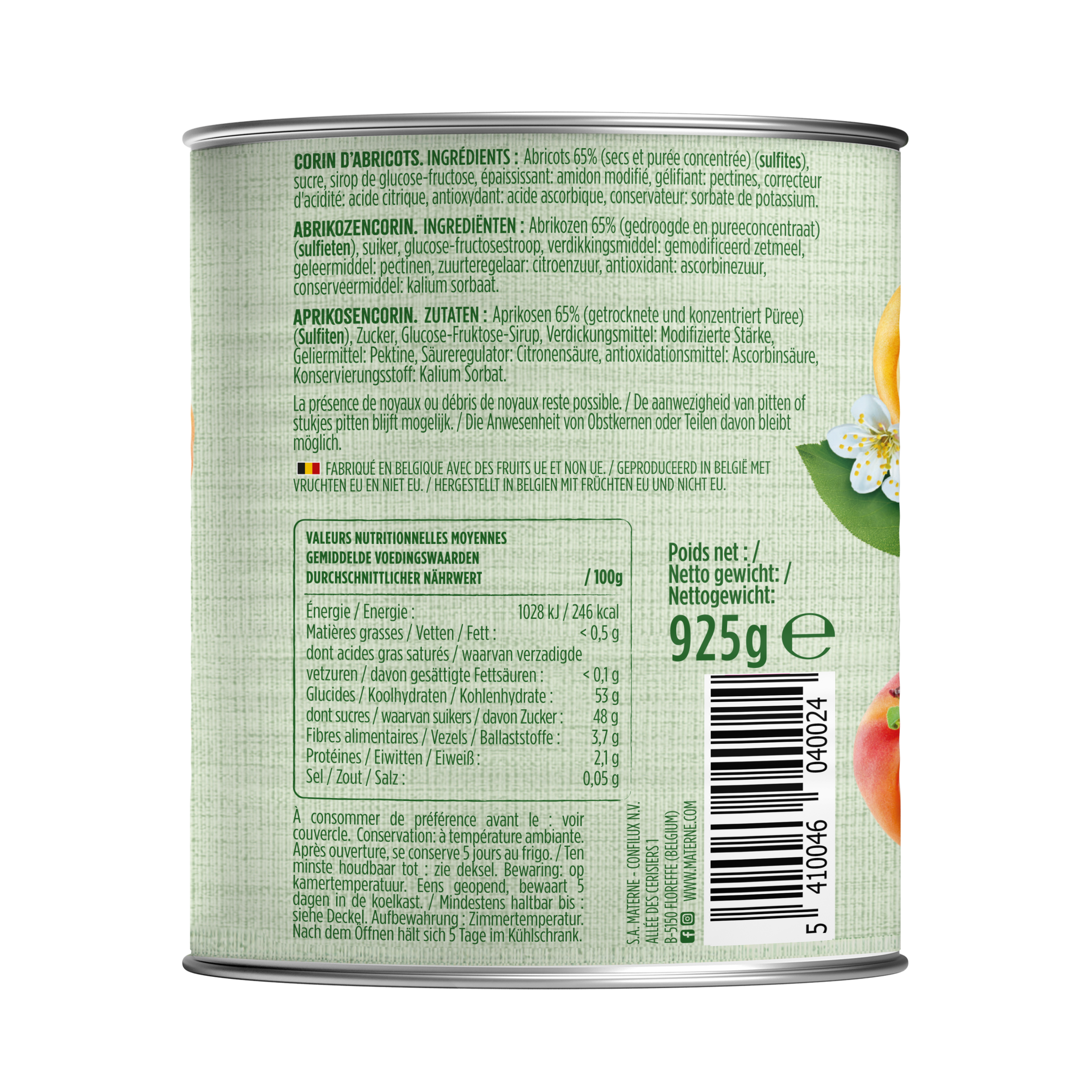 Abricots 65% (secs et purée concentrée) (sulfites), sucre, sirop de glucose-fructose, épaississant: amidon modifié, gelifiant: pectines, correcteurs d'acidité: acide citrique, antioxydant: acide ascorbique, conservateur: sorbate de potassium.